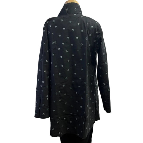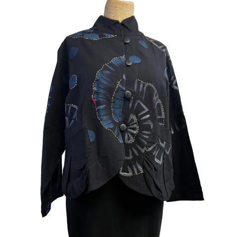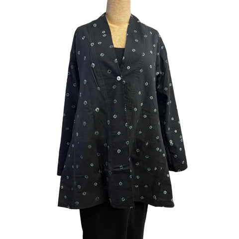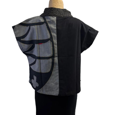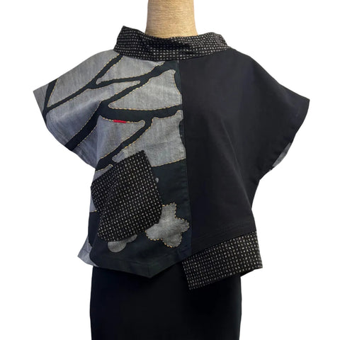 This colorful abstract patterned top in combinations of salmon, mustard, grey, and green is digitally printed from Andrea’s original abstract paintings onto the fabric to create a dynamic combination of...