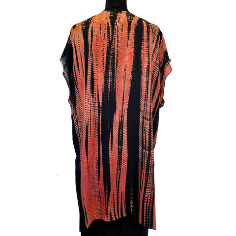 Ideal for warmth without weight, this lovely shibori-dyed silk wrap in shades of cranberry accented with black vertical stripes features easy armholes and a hemline that gently dips on each...