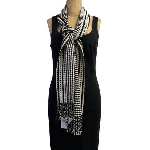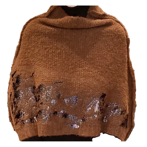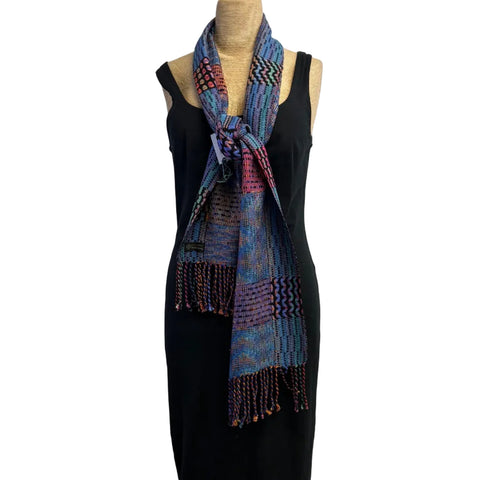 This breathtaking one-of-a-kind hand-woven, hand-dyed silk shawl features large blocks with graphic color-and-weave effects that alternate with multiple weave flowing patterns. Featuring radiant shades of red and purple with multi-color highlights, it...
