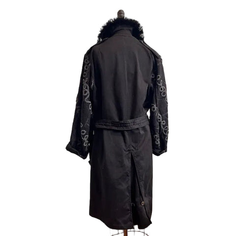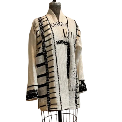 This exquisite hand-painted silk kimono captures the vibrant hues of the northern lights, reflecting Catherine’s exceptional artistry in wearable masterpieces. Featuring an open front trimmed with a delicate multi-color stripes,...