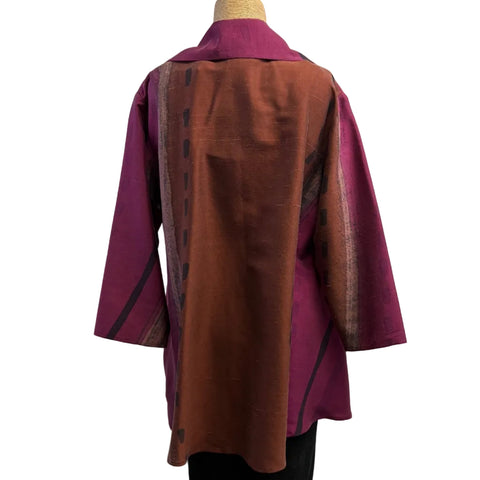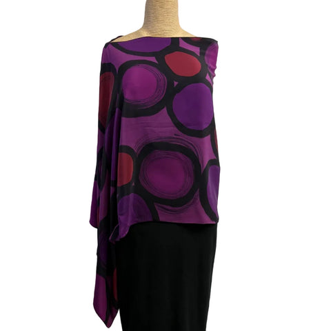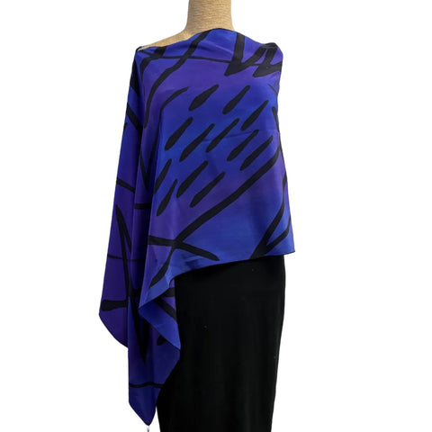 This stunning hand-painted A-line silk shirt in vibrant shades of periwinkle blue, purple, orange and black features arrows, waves, dots, arrows, and diagonal stripes, accented with soft black and white...