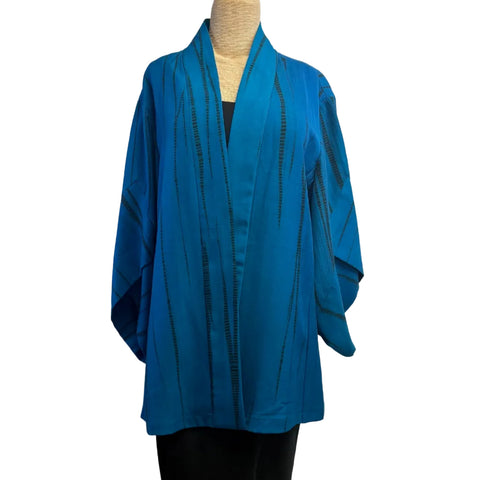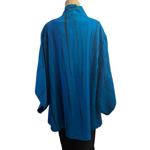 This striking coffee silk shirt is embossed with symmetrical geometric shapes and accented with shibori-dyed turquoise vertical stripes. It features a stand-up collar with one button closure, long sleeves, and...