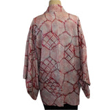 This unique patchwork jacket is truly a work of art. It is created using up-cycled remnants in varying shades of red, gold, blue, and brown fabrics, accented with decorative stitching...