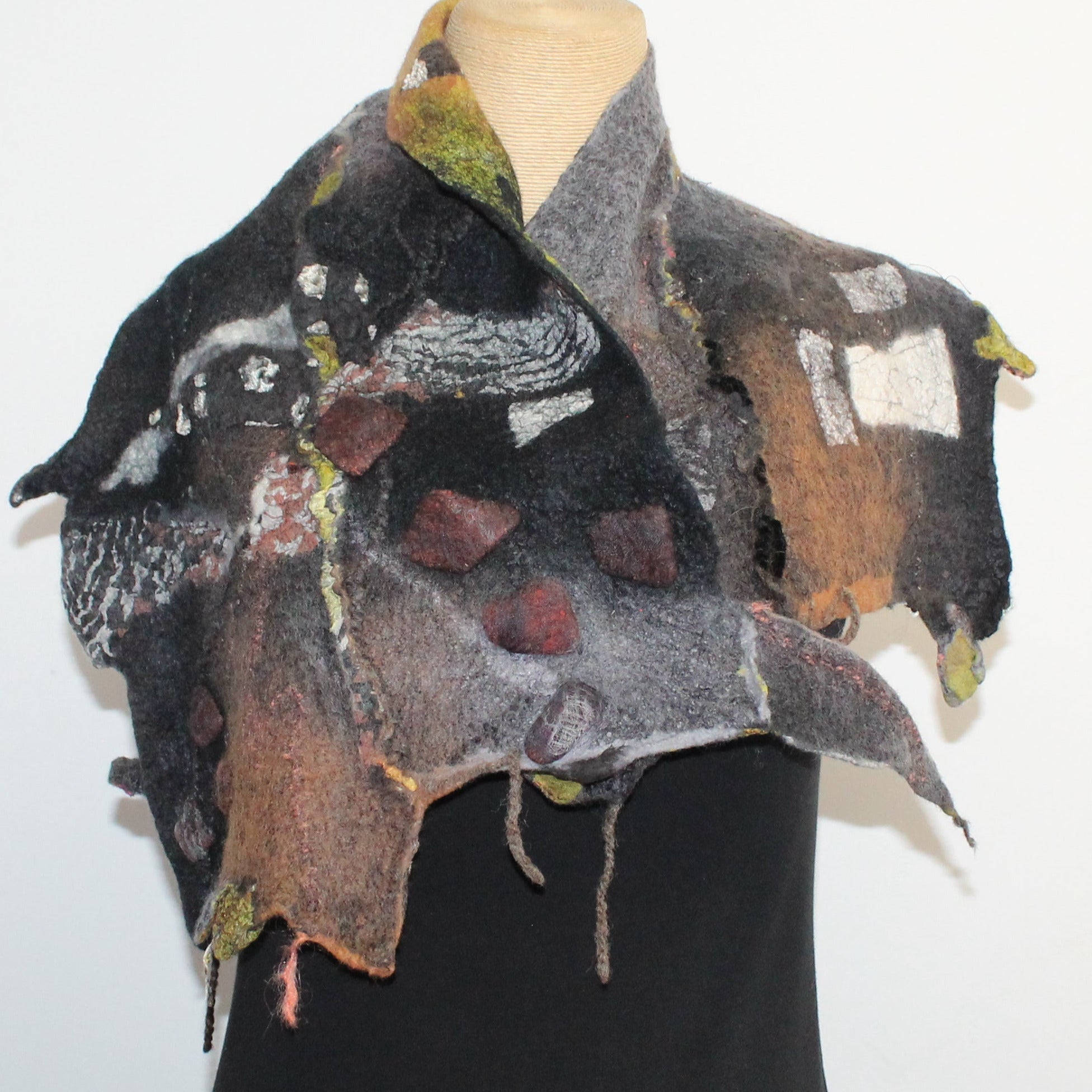 Experience the exquisite artistry of Nuno felting with this uniquely textured scarf. Crafted from soft wool and a blend of silk fabrics in shades of yellow, espresso, with pops of red and white, the resulting textile is a sculptural work made without any stitching or sewing. The large felted brooch makes it simple to elegantly customize the scarf’s length and drape. With a reversible front and back, this ever-evolving accessory offers endless styling possibilities, embodying a sophisticated fusion of function and art. Hand wash cold.