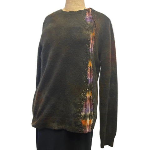 Meet your new favorite layer—a reclaimed cashmere sweater that's equal parts sophisticated style and fun! Hand-dyed in deep olive with a decorative zig-zag hand-stitched motif along a multicolored vertical inset,...