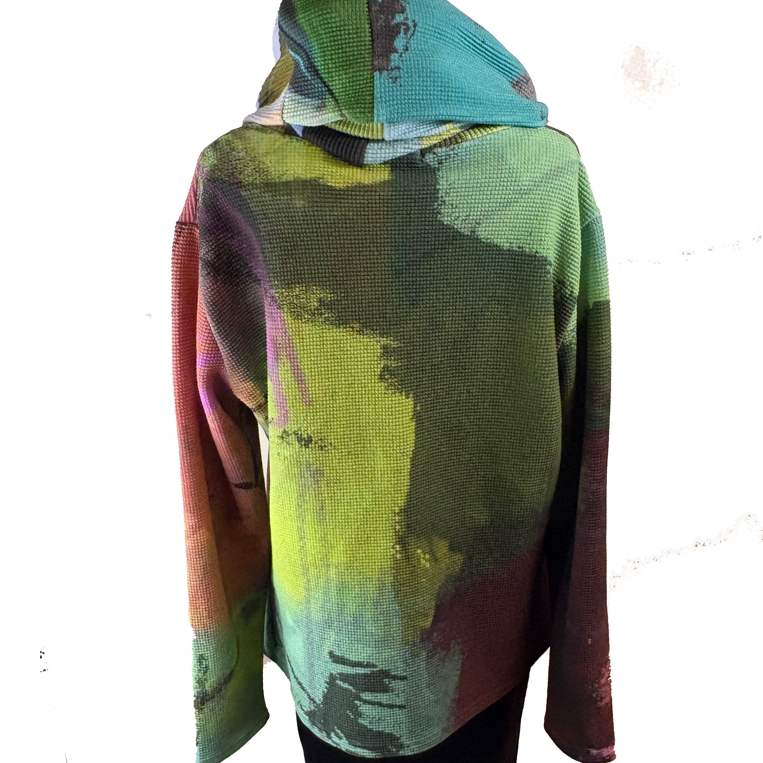 This colorful abstract patterned top in combinations of salmon, green, and rust is digitally printed from Andrea’s original abstract paintings onto the fabric to create a dynamic combination of color and pattern. A coordinating detachable infinity scarf that may be worn long or folded over offers multiple styling options. The top is designed in a thermal textured cotton knit with long sleeves, a round banded collar, and an easy, comfortable fit. Since each piece is handmade, the placement of the designs in each size may vary slightly from the pictures. 95% organic cotton and 5% spandex. Gentle cool wash. Lay flat to dry or tumble dry low.