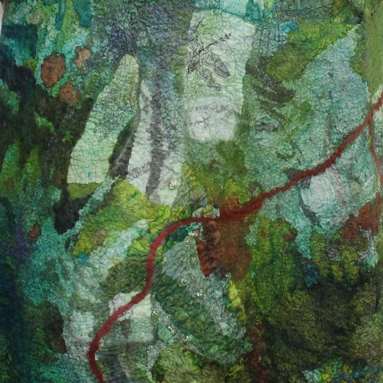 Experience the exquisite artistry of Nuno felting with this uniquely textured multi-color vest. Crafted from soft wool and a blend of silk fabrics in vibrant shades of green with pops of rust, aqua and white,, the resulting textile is a sculptural work made without any stitching or sewing. With large felted buttons for closure and a reversible front and back, this ever-evolving statement piece offers endless styling possibilities, embodying a sophisticated fusion of function and art. Hand wash cold.