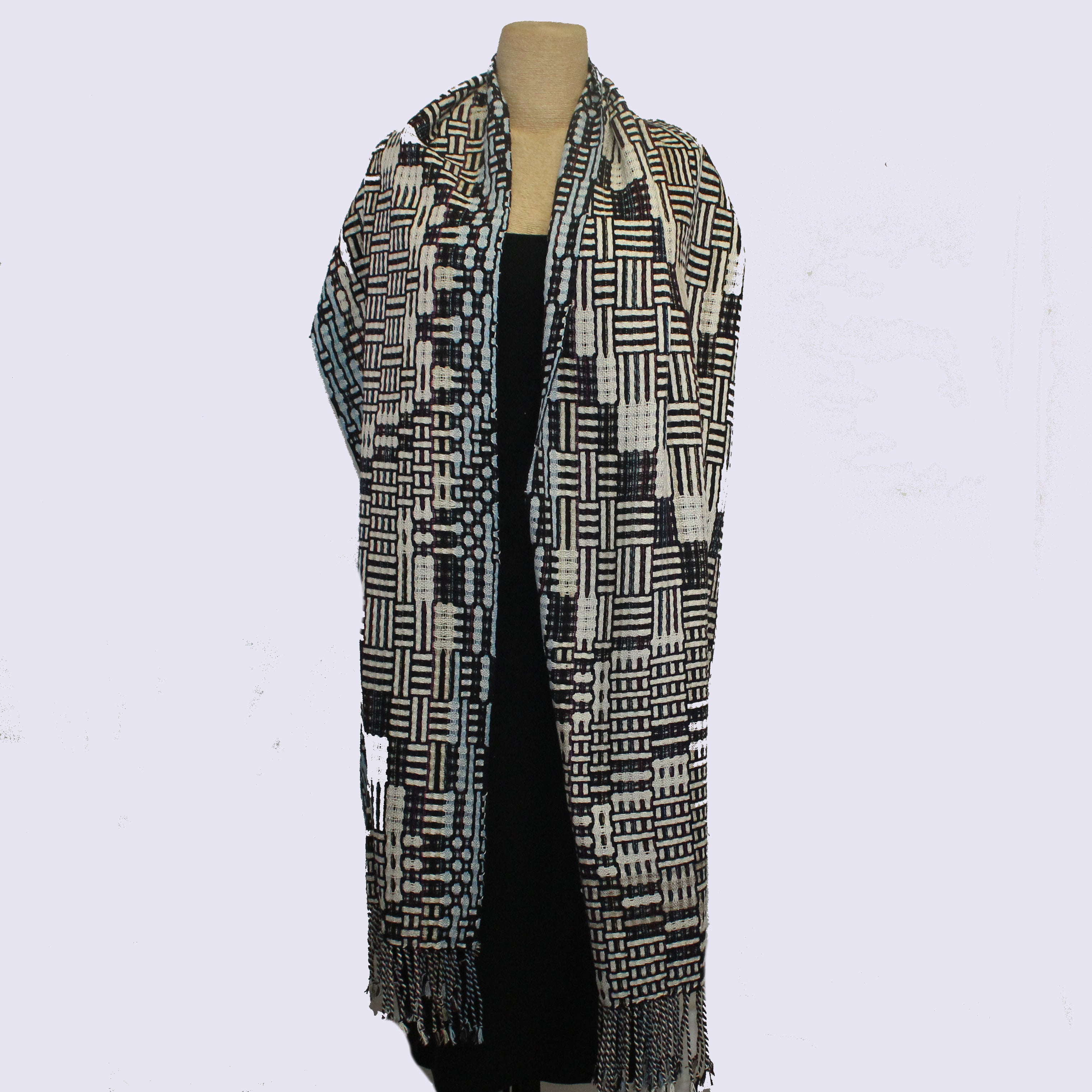 Hand-dyed and hand-woven black and white silk shawl featuring color-and-weave effect patterns in lively waves with subtle accent colors and threads in sky blue, blue, gold, red, copper, and tan. 100% silk. Hand wash cold or dry clean.